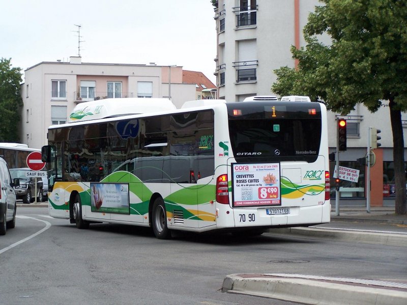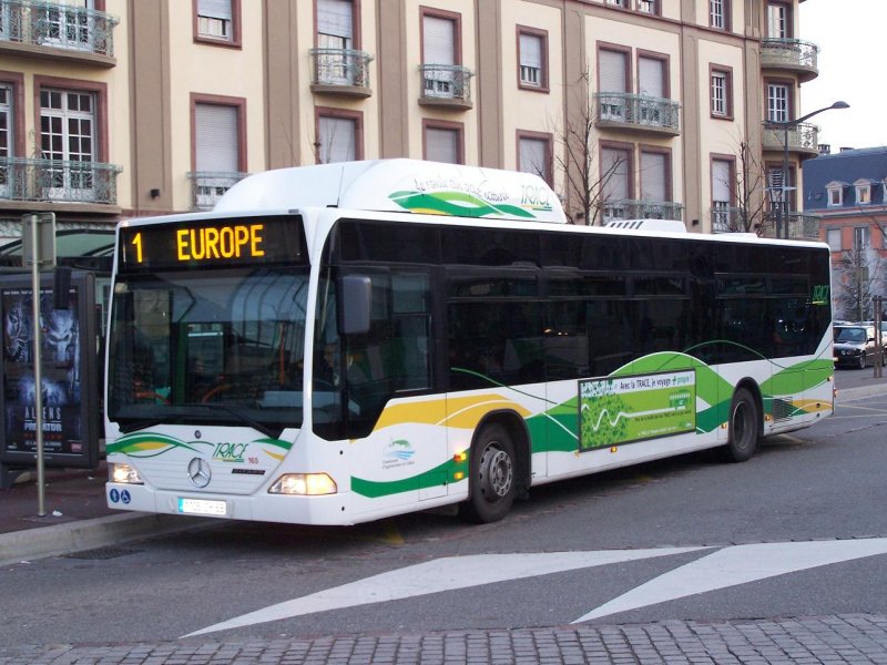 Neuer Erdgasbus Mercedes-Benz O 530 CNG (Citaro) im elsässischen Colmar. Drei Exemplaren wurden im Sommer 2008 in Dienst gestellt. Sie erhielten die Wagennummern 269 bis 271. Das Bild zeigt den Wagen 269 an der Haltestelle Unterlinden in der Innenstadt von Colmar.