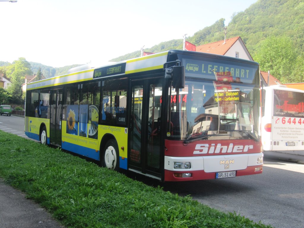 Ein mittlerweile durch einen Setra S415NF ersetzer MAN NL263 der Sihler KG. Zugelassen als GP-SI-490 und mit Werbung für Mirjam Care versehen. Dennis D.