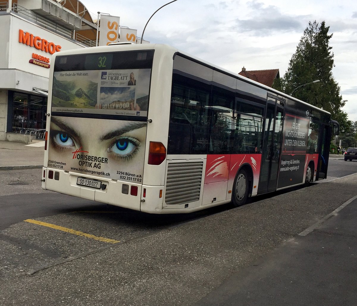 Citaro CNG Nr. 24 mit Vollwerbung für den Libero Tarifverbund, am 18.5.2016 beim Bhf Süd.