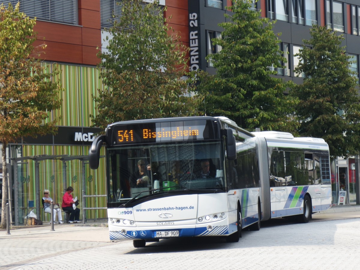 Hier sieht man einen der neuen Solaris Urbino 18,75 der Hagener Straßenbahn AG auf der Linie 541 in die Stadtmitte von Hagen einfahren. Es handelt sich um den Wagen: HA- DF909 Peter van Watermeulen