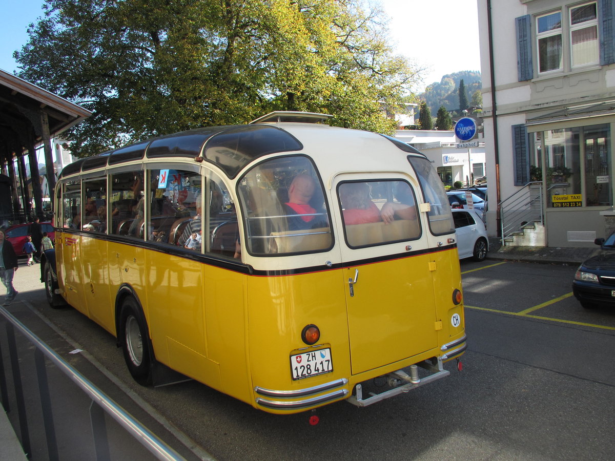 Ein Saurer Panoramawagen von Oldietours Limmattal steht für die nächste Publikumsfahrt während des Dampfbahntreffens des DVZO am Bahnhofplatz Bauma bereit, am 14.10.17 Kai Brunner
