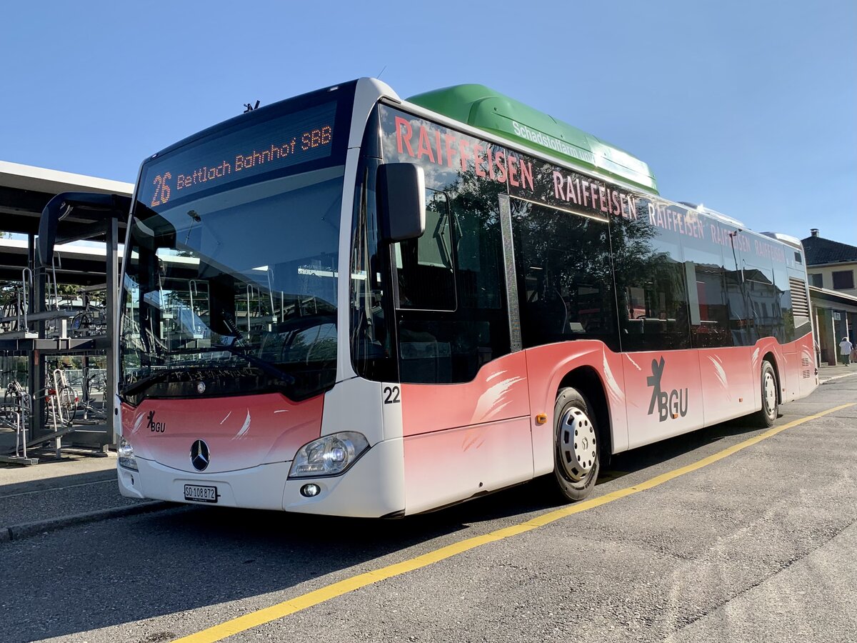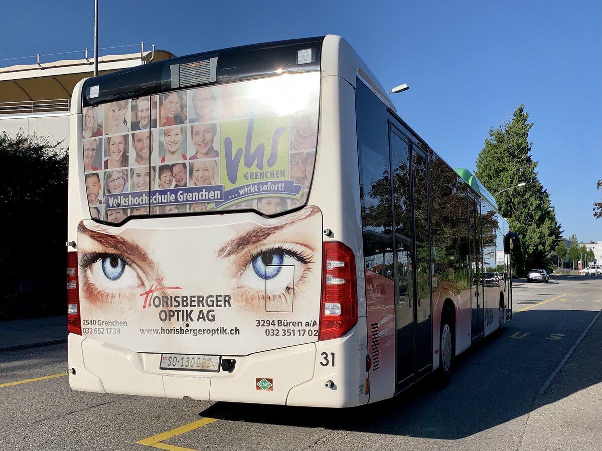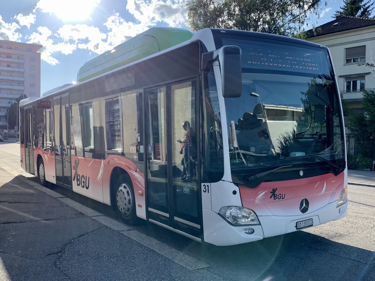 Heckansicht des MB C2 NGT Nr. 31 der BGU am 10.8.21 beim Bahnhof Grenchen Süd.