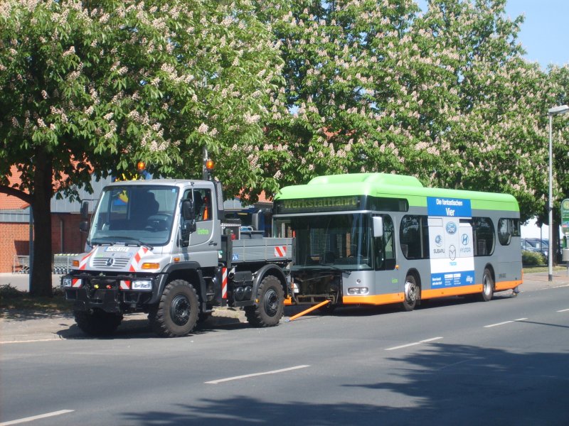 Der Unimog der den defekten O530 CNG in Richtung Vahrenwald abschleppen wird, steht noch einige Meter entfernt vom Bus und wird zum  Andocken  bereitgemacht