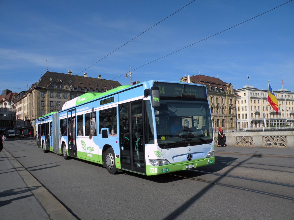 Mercedes Citaro mit der Betriebsnummer 728 und der Vollwerbung für Erd- und Biogas auf einer Dienstfahrt am Claraplatz. Die Aufnahme stammt vom 05.09.2010. Markus Wagner