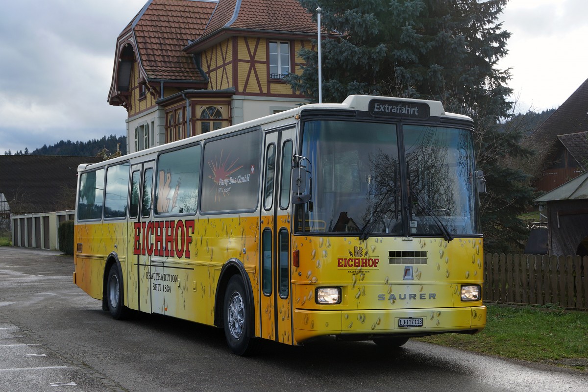 SAURER POSTAUTO: Ehemaliges Saurer Postauto als Party-Bus mit Eichhof Werbeaufschrift wartet am 20. Dezmber 2014 in Rohrbach auf Party-Gäste.