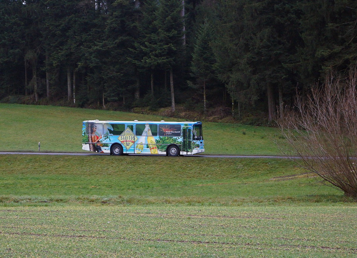SAURER POSTAUTO: Ehemaliges Saurerpostauto als PARTY-BUS im Emmental auf einsamer Flur unterwegs bei Gondiswil am 6. Dezember 2014. Vielleicht steht es ja wenigstens am Abend an einer "CHLAUSENPARTY" im Mittelpunkt.