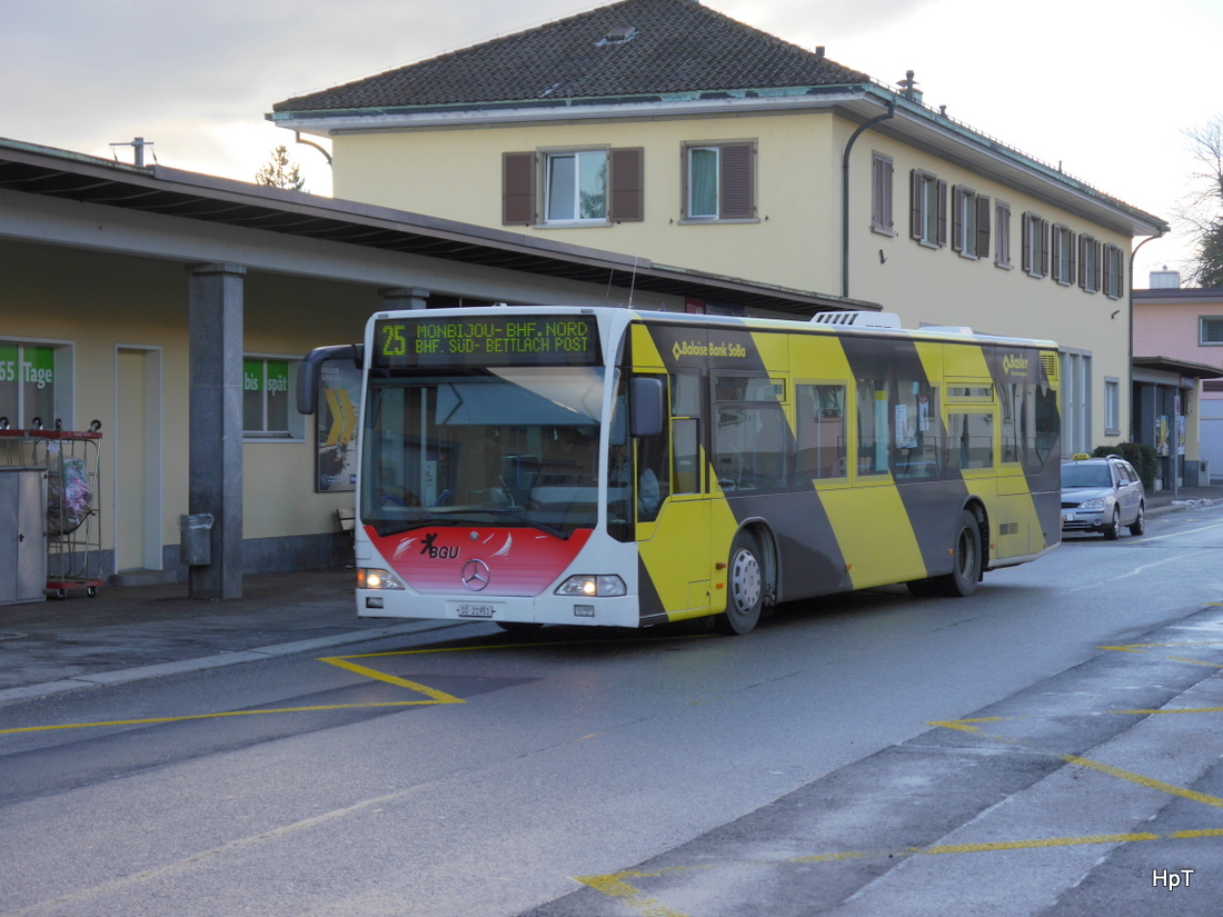 Der BGU Citaro I Nr. 17 steht beim Bahnhof Grenchen Süd. Der Wagen ist auf der Linie 38 zum Grenchenberg im Einsatz, deshalb hat er Schneeketten montiert, denn über Nacht hat es am Jura geschneit, 28.11.2015. Simon Bütikofer