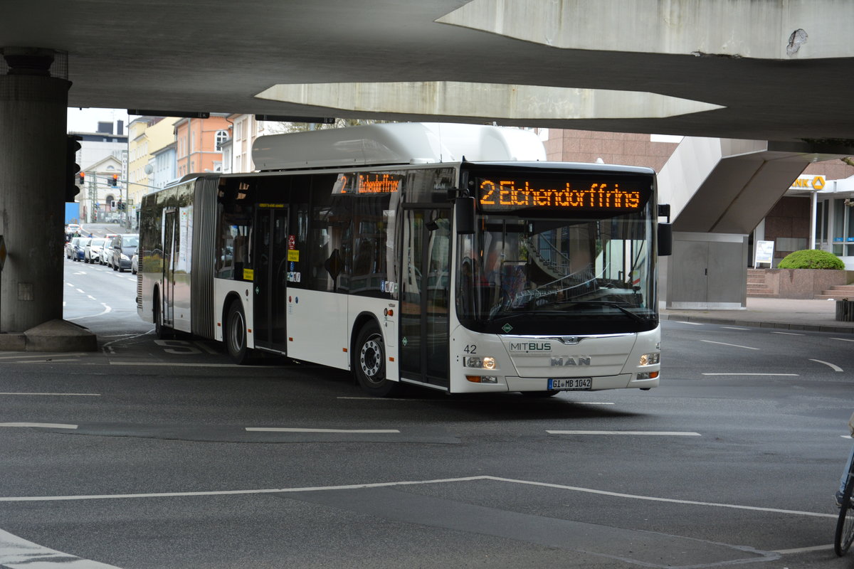 Am 19.04.2016 fährt GI-MB 1042 auf der Linie 2 durch Gießen. Aufgenommen wurde ein MAN Lion's City G CNG / Gießen Innenstadt.