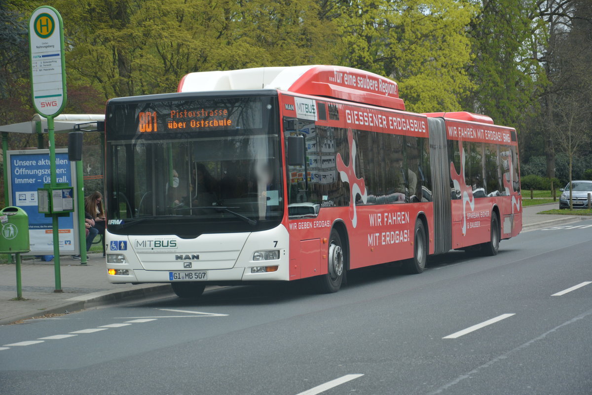 Am 19.04.2016 fährt GI-MB 507 auf der Linie 801 durch Gießen. Aufgenommen wurde ein MAN Lion's City G CNG / Gießen Nahrungsberg.