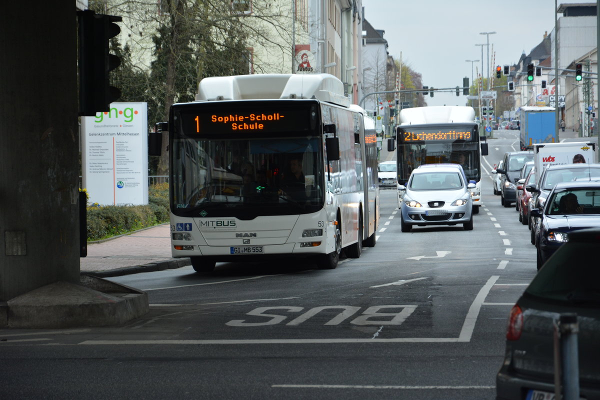 Am 19.04.2016 fährt GI-MB 553 auf der Linie 1 durch Gießen. Aufgenommen wurde ein MAN Lion's City G CNG / Gießen Innenstadt.