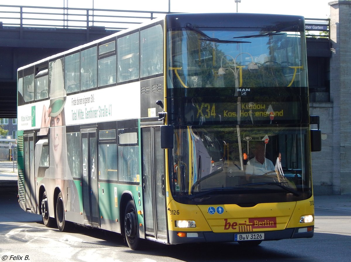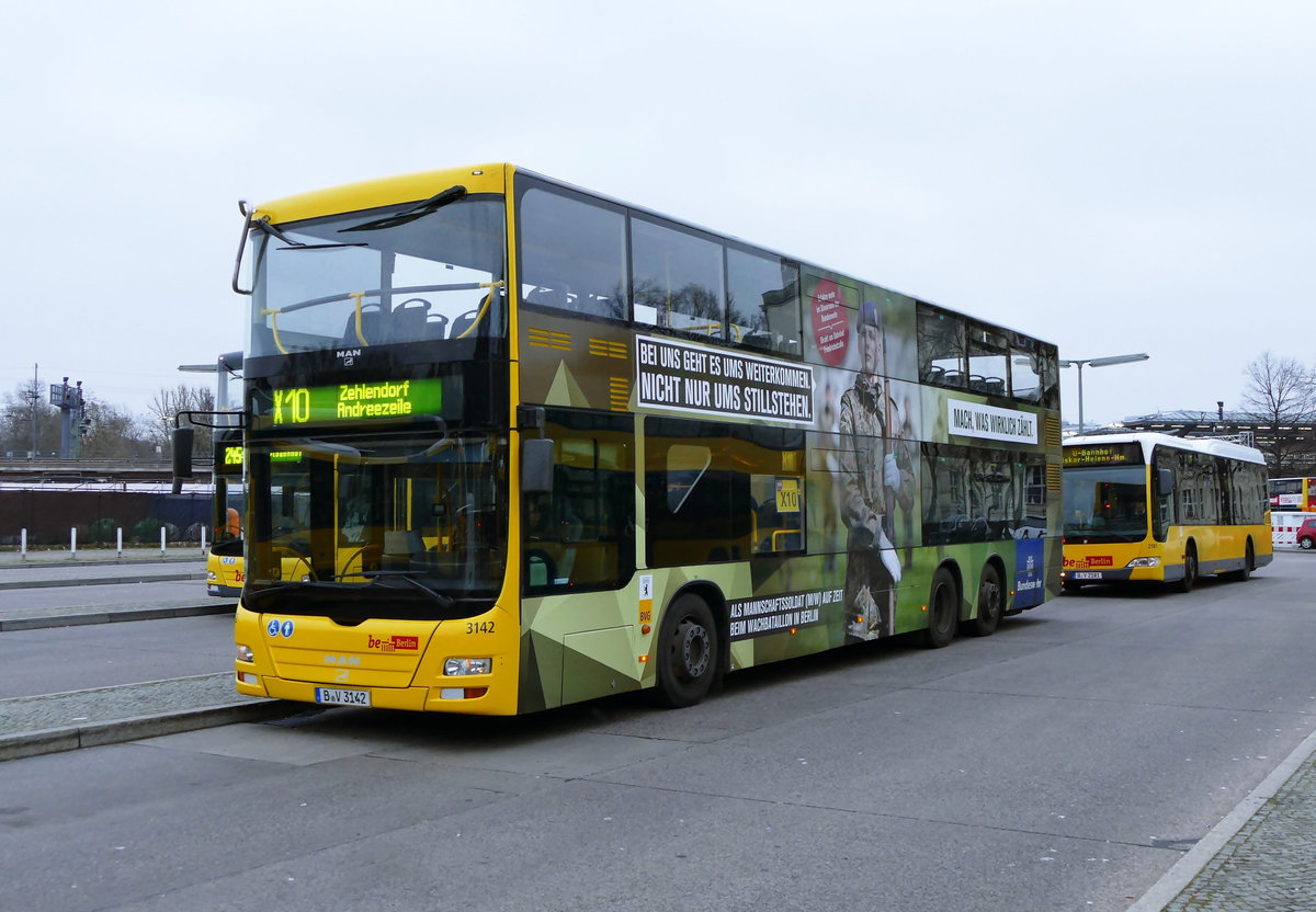 MAN Lion's City DD der BVG, Wagen '3142' (m. Astabweiser)  als X10 in Berlin /Hertzallee im Dezember 2017.