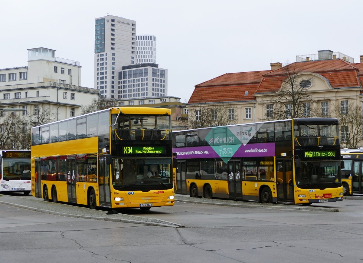 MAN Lion's City DD der BVG, Wagen '3136' (m. Astabweiser) & Fahrzeug '3469' der Linien X34 & M46 in Berlin /Hertzallee im Dezember 2017.