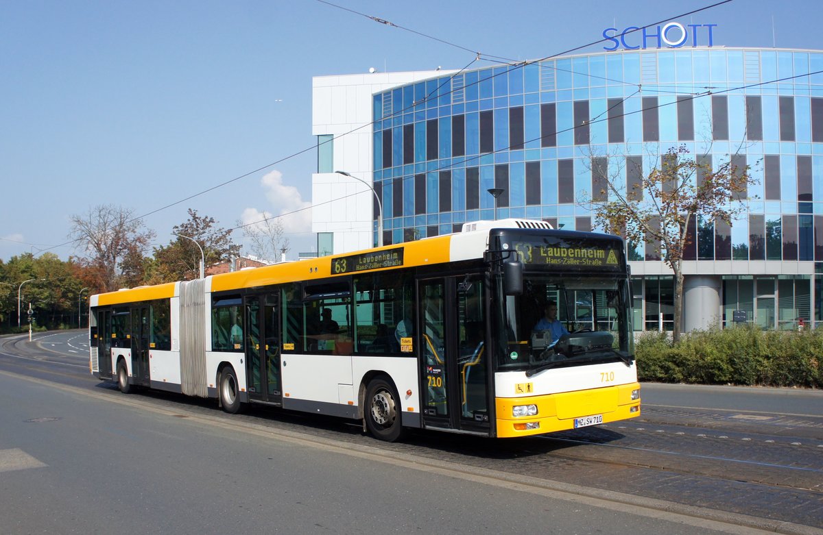 Stadtbus Mainz: MAN NG der MVG Mainz / Mainzer Verkehrsgesellschaft (Wagen 710), aufgenommen im September 2018 in der Nähe der Haltestelle "Bismarckplatz" in Mainz. N8Express