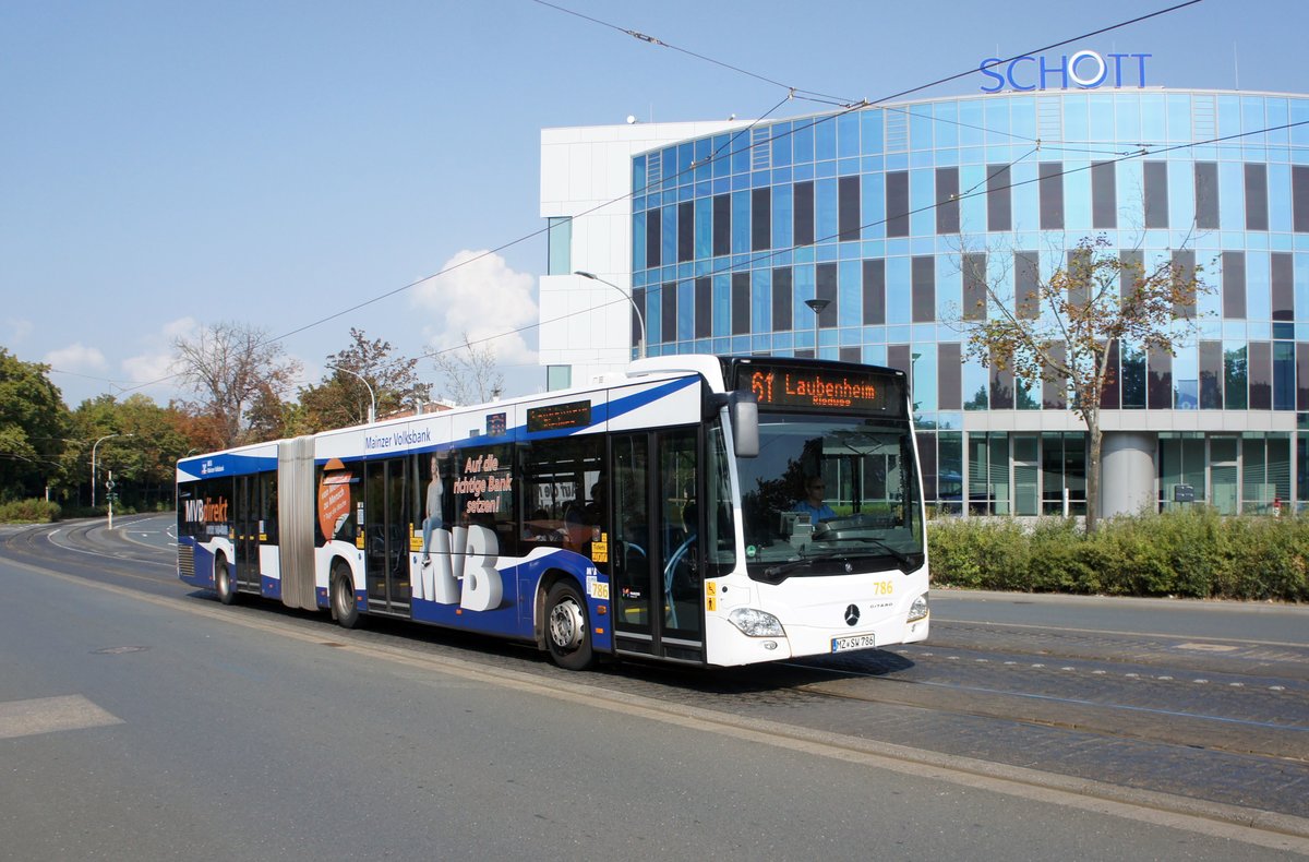 Stadtbus Mainz: Mercedes-Benz Citaro C2 Gelenkbus der MVG Mainz / Mainzer Verkehrsgesellschaft, aufgenommen im September 2018 in der Nähe der Haltestelle "Bismarckplatz" in Mainz. N8Express