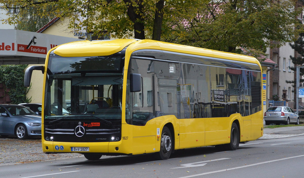 Der recht neue E-Bus vom Typ eCitaro EN19 der Berliner Verkehrsbetriebe (BVG Nr. 1827) auf der Linie 259 am 11.10.19 Berlin Weißensee. Lothar Stöckmann