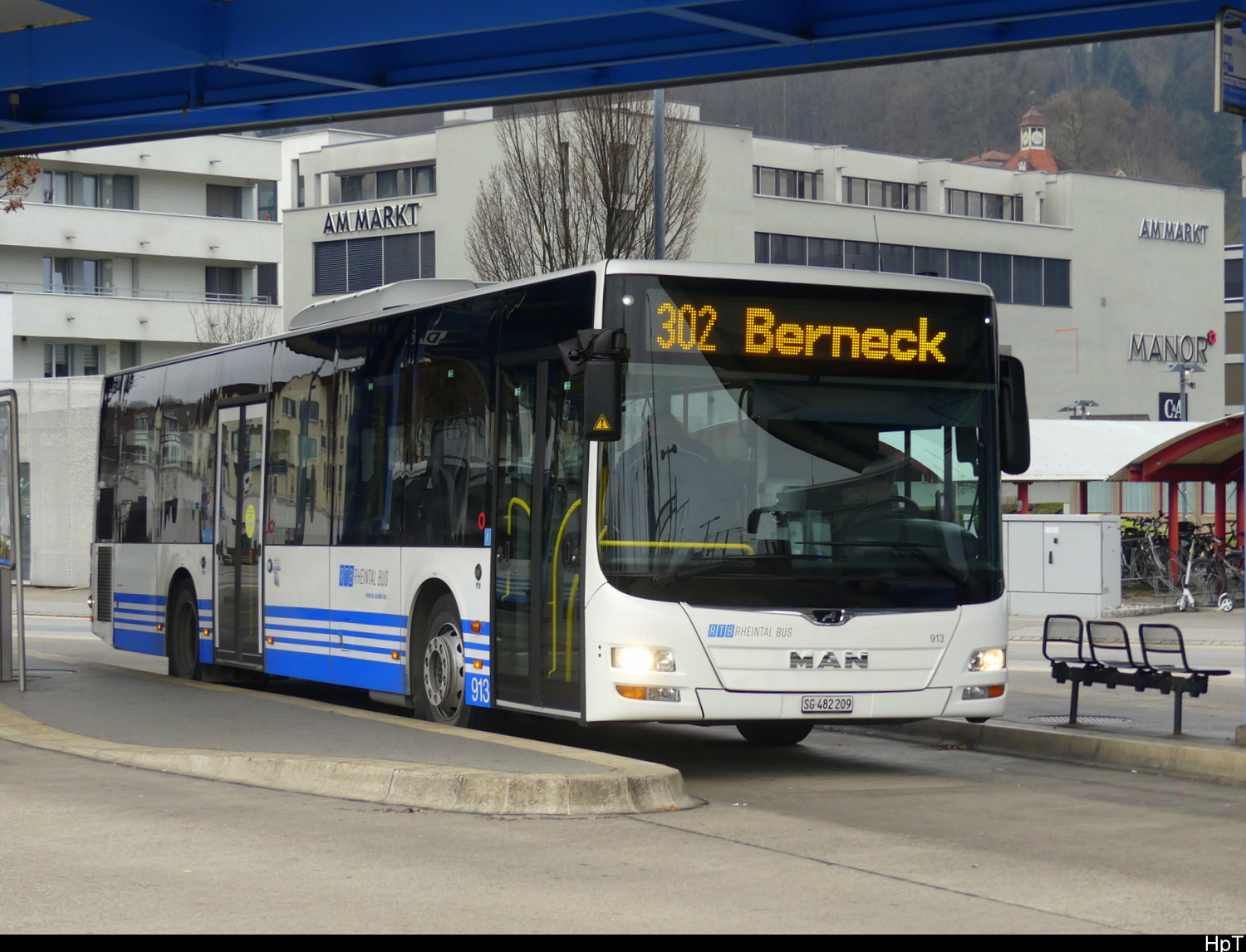 RTB - MAN Lion`s City Nr.913 SG 482209 bei den Haltestellen beim Bahnhof Heerbrugg am 26.12.2025