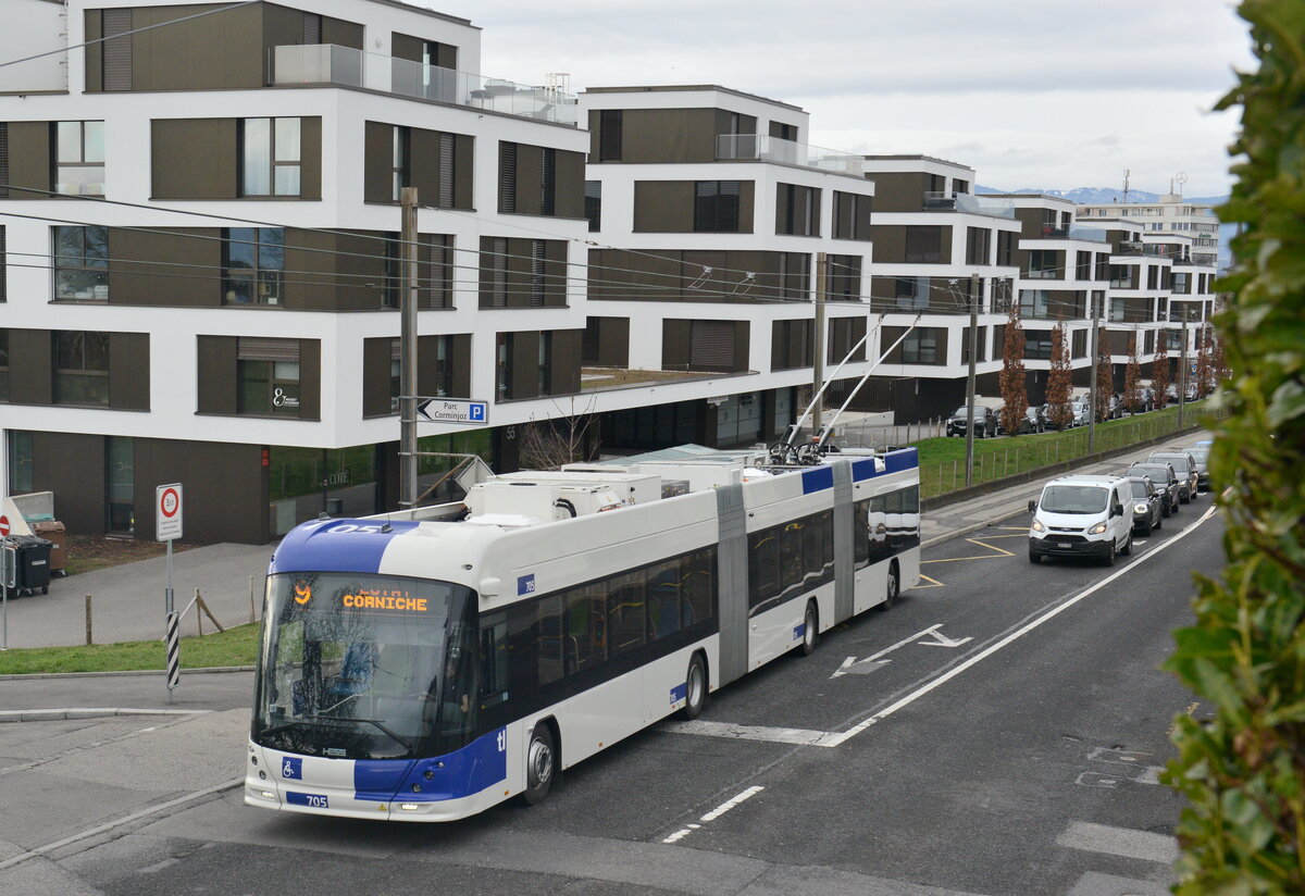 Trolleybus articulé Hess BGGT-N2D ° lighTram® 25° 705   Ici à Prilly Perréaz.
