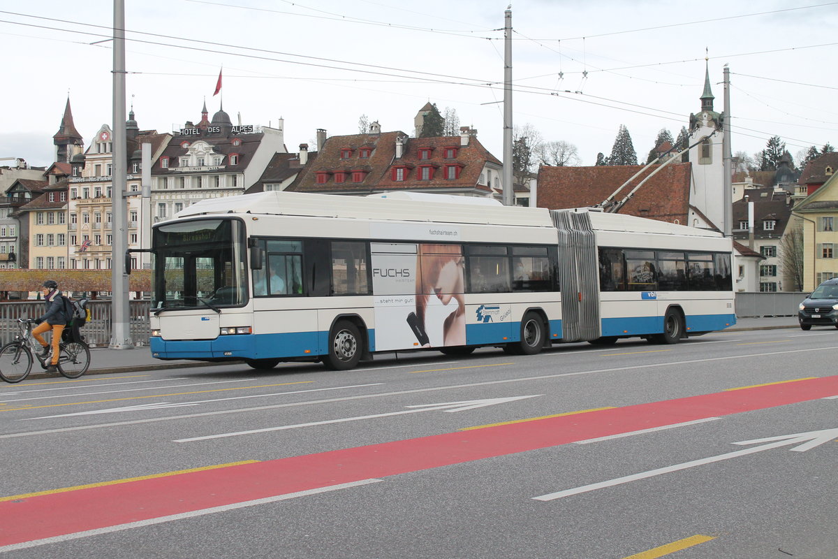 vbl Nr. 201 (Hess Swisstrolley 3 BGT-N2C) am 11.3.2021 auf der Seebrücke. Dies ist momentan der älteste vbl Wagen, der noch im täglichen Kurseinsatz ist.