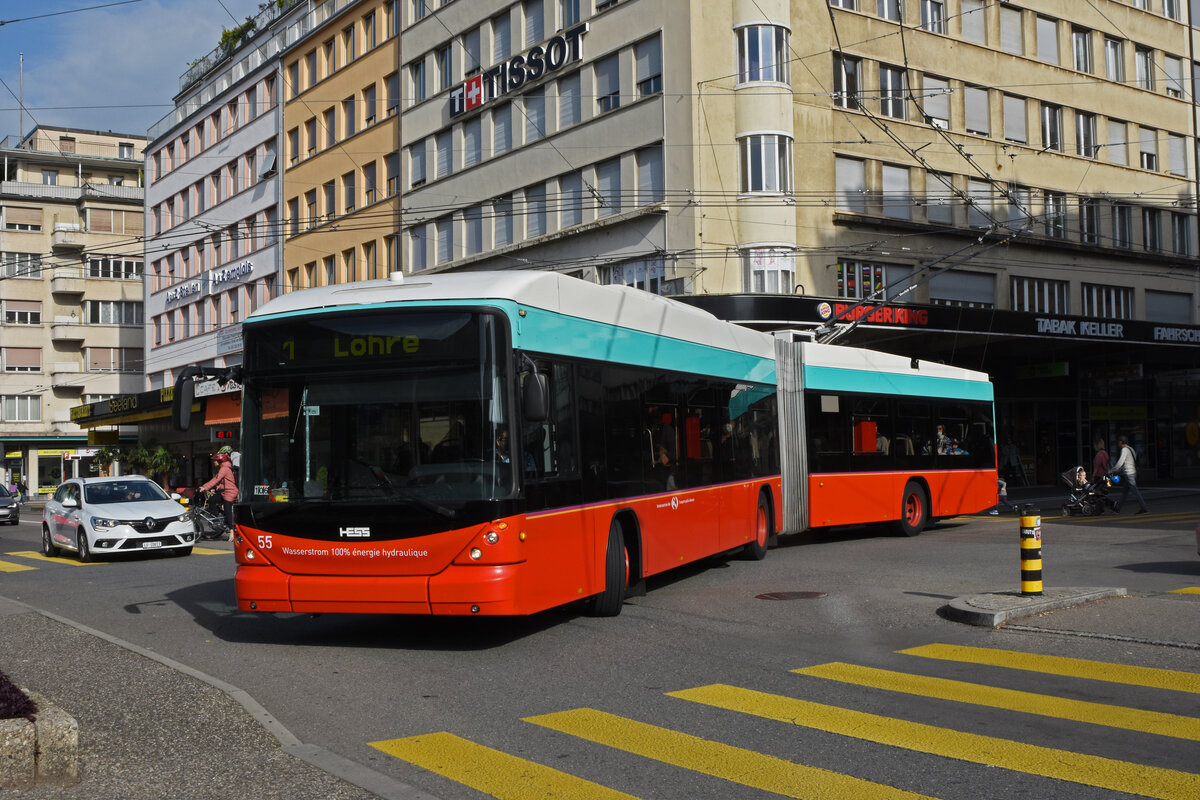 Hess Trolleybus 55, auf der Linie 1, fährt zur Haltestelle beim Bahnhof Biel. Die Aufnahme stammt vom 25.09.2021.