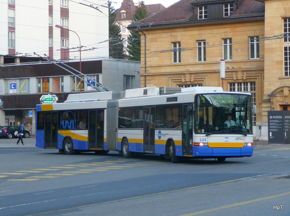 trn La Chaux de Fonds - Solaris Trolleybus Nr.123 unterwegs auf der Linie 4 beim Bahnhof von La Chaux de Fonds im Abendlicht am 22.03.2011