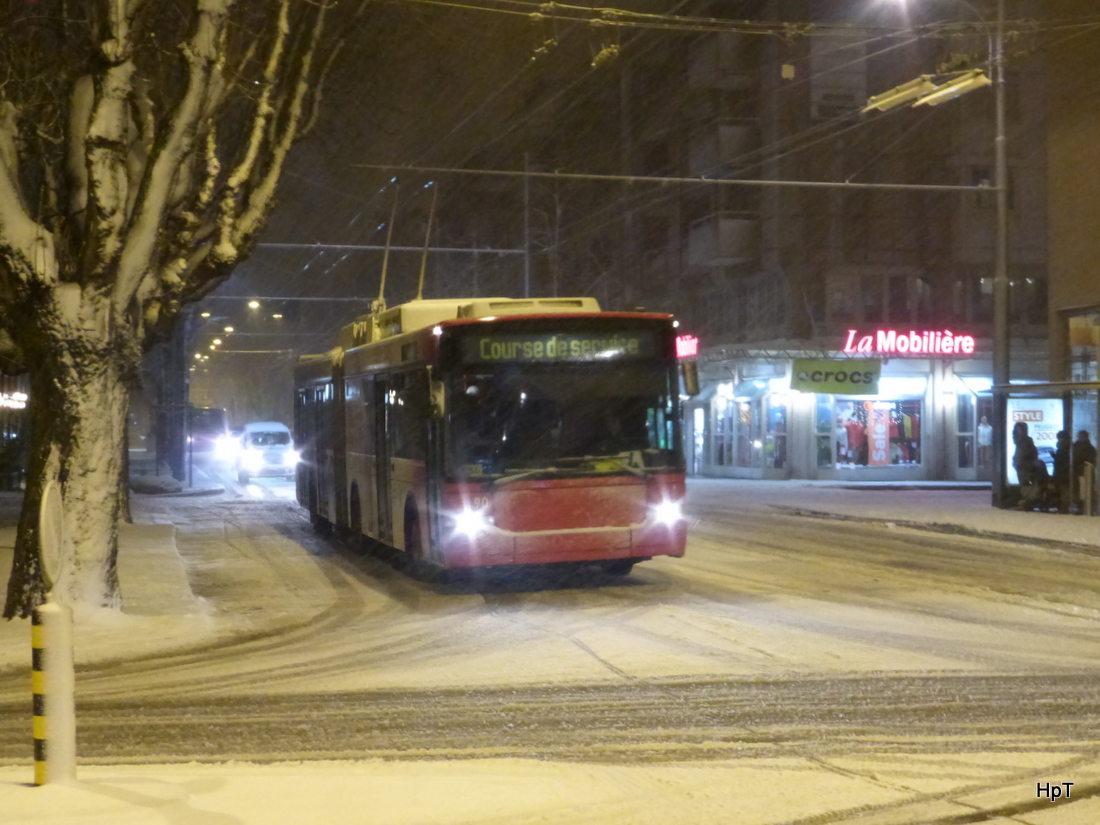 VB Biel - NAW Trolleybus Nr.90 unterwegs auf Schneebedeckter Strasse mit viel viel mühe auf der Linie 4 in der Stadt Biel am 30.01.2015