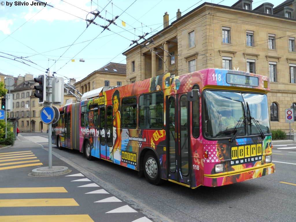 TN Nr. 118 ''Métro'' (NAW/Hess BGT 5-25) am 27.7.2010 beim Plache Pury, wie man sieht, gibt's auch in Neuenburg eine Métro Boutique