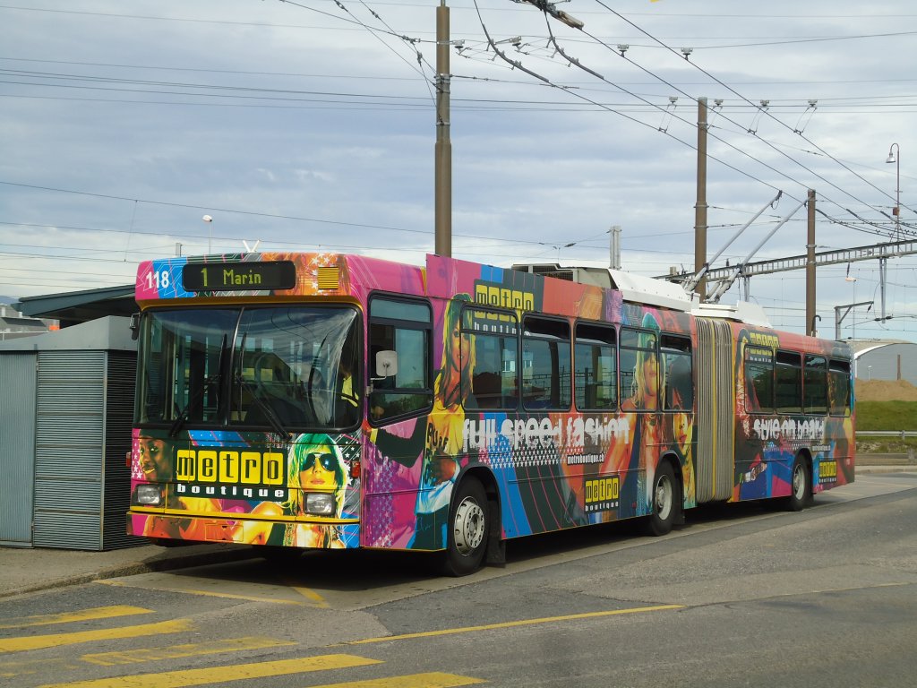 TN Neuchâtel Nr. 118 NAW/Hess Gelenktrolleybus am 4. Oktober 2010 Marin, Bahnhof (mit Vollwerbung für "metro boutique")