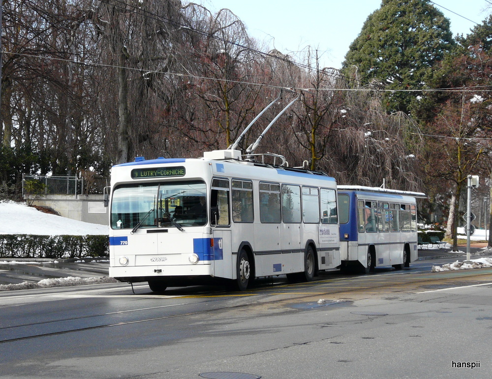 tl - NAW Trolleybus Nr.770 mit Anhänger unterwegs auf der Linie 9 in der Stadt Lausanne am 16.02.2013