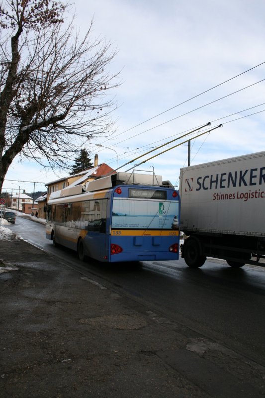 Solaris Trollino 12 AC Nr. 133 bei einem kritischen Überholmanöver bei Pâquerette. Der Fahrer hatte den Bus erst abgebügelt, aber als die unzuverlässige Diesel-Notfahrt nich ansprang musste er das Manöver doch mit den Ruten an der Fahrleitung machen - eine Sache von wenigen cm!