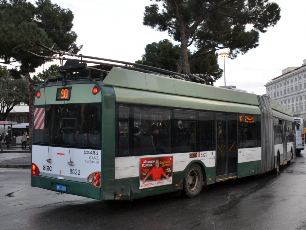 Rom, 2.2.2013: Solaris-Ganz Trollino 18 als Linie 90 im oberleitungsfreien Abschnitt an der Endstation Staz. Termini. Die Strecke Staz.Termini bis Porte Pia wird im Batteriebetrieb gefahren.