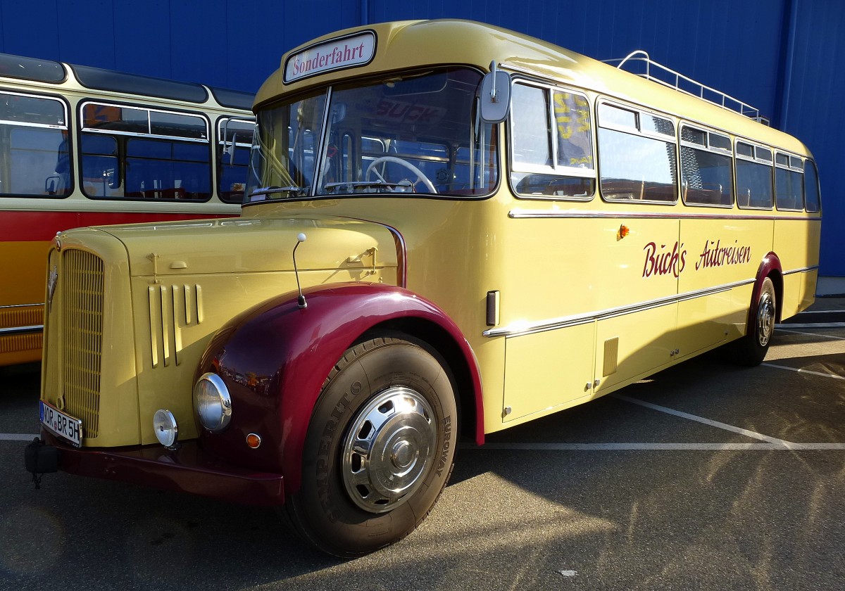 Saurer, dieser Reisebus wurde in den Saurerwerken in Wien gebaut, Europatreffen historischer Busse in Sinsheim, April 2014