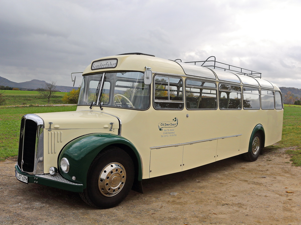 Saurer Bus aus dem Jahr 1960 seht auf den Weg in Richtung Bad Schandau am 23. Oktober 2021.