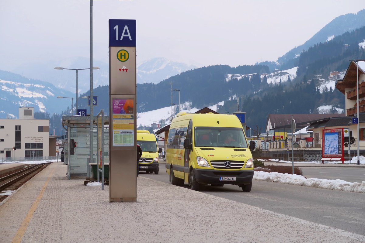Regiotax Stummerberg bleibt direkt am Bahnsteig der Zillertalbahn am Bhf. Kaltenbach-Stumm i. Z. stehen. Aufgenommen 26.2.2018.