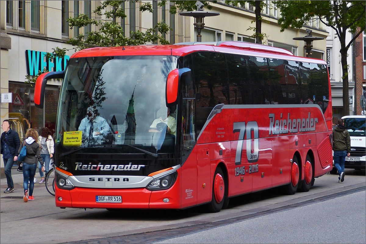 Setra S 516 HD von Reicheneder Reisen, aufgenommen in den Straßen von Hamburg am 18.09.2019.