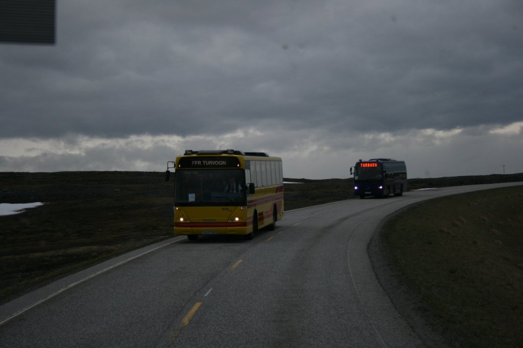 Der Besuch eines Kreuzfahrtsschiffes in Honningsvag bedeutet je nach Reiseanbieter für Cominor oder Veolia Grossandrang: Mit diversen Reisebussen werden bis zu 1500 Reisende in kurzer Zeit aufs Nordkapp und zurück befördert. Zum Einsatz kommen nebst diversen älteren Kombibussen wie dem Scania/Vest vorne auch ehemalige Volvo-Vorführwagen wie der blaue 9700 im Hintergrund. Die Aufnahme entstand wenige Kilometer unterhalb dem nördlichsten Punkt Europas.