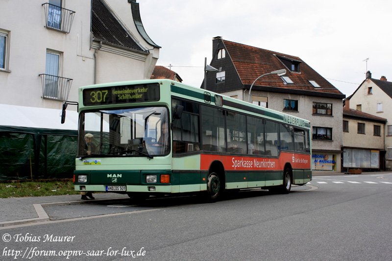 30.03.09: Hier sehen wir den ex NVG-Wagen 228, der nun bei Dieter Schmidt in Marpingen zum Einsatz kommt. Über den Zustand des Fahrzeuges brauche ich nichts zu sagen, wer sich das Bild genauer ansieht wird schnell feststelle, dass es dem Wagen schon mal wesentlich besser ging. Das Foto zeigt den WND-DS 509 auf der Linie 307 am Rathaus Schiffweiler.
