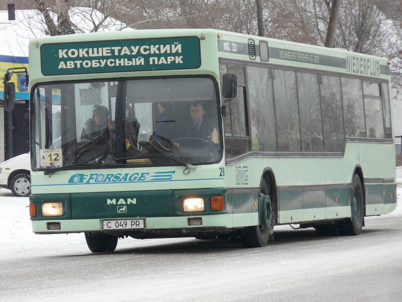 Diesen MAN-Niederflur Bus habe ich am 11.11.2009 gesehen. Neunkircher Verkehrs-AG und die alte Wagennummer 223 standen noch dran. Hier fährt er in Kokshetau auf der Linie A 12.