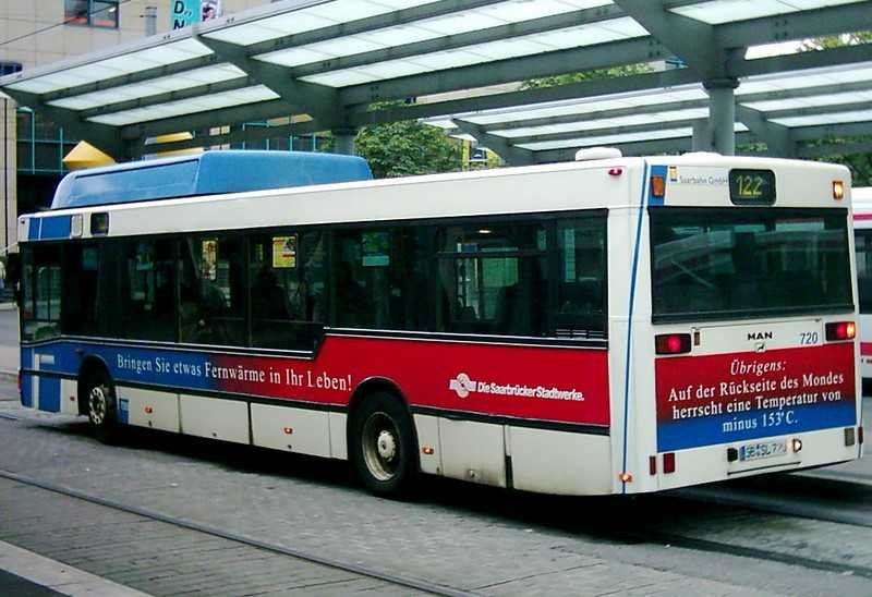 Wagen 720 der Saarbahn AG als Linie 122 am 07.09.07 Hauptbahnhof Saarbrücken. Fahrzeug trägt die Stadtwerke Werbung