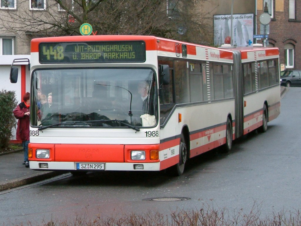 MAN NG 272 1988 der Dortmunder Stadtwerke. Dieser Bus hatte ein zweites Leben bei der DSW, denn er kehrte als 1988 für kurze Zeit als Leihwagen von MAN nach Dortmund zurück. Aufgenommen am 09.01.2004 in Dortmund Löttringhausen.