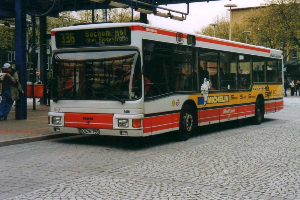 Bogestra 9410, ein MAN NL202, aufgenommen im Mai 2002 in Bochum am Hauptbahnhof.