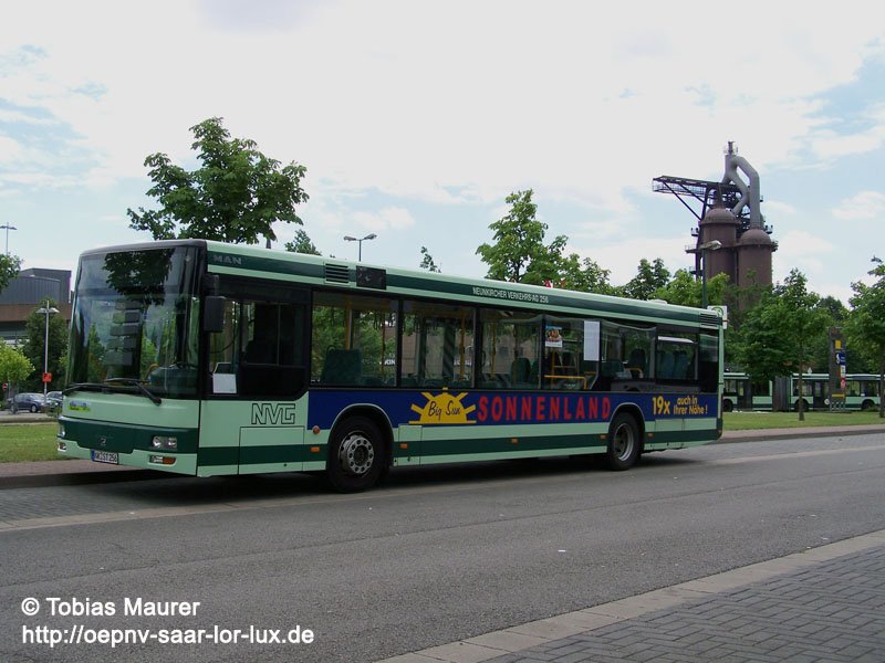 19.06.08: NVG Wagen 256, ein MAN NL 263, steht abgestellt auf dem Busparkplatz am Spitzbunker in Neunkirchen, im Hintergrund sieht man das alte Hüttenareal und einen gerade ausrückenden Gelenkwagen der NVG.