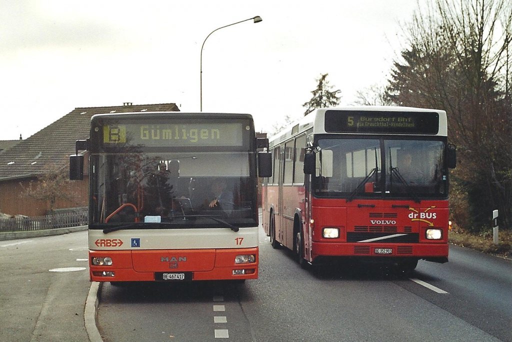 Aus dem Archiv: RBS, Worblaufen Nr. 17/BE 467'417 MAN und AAGK, Koppigen Nr. 4/BE 352'903 Volvo am 4. Dezember 2004 bei der Haltestelle Bolligen Chrottengässli.
