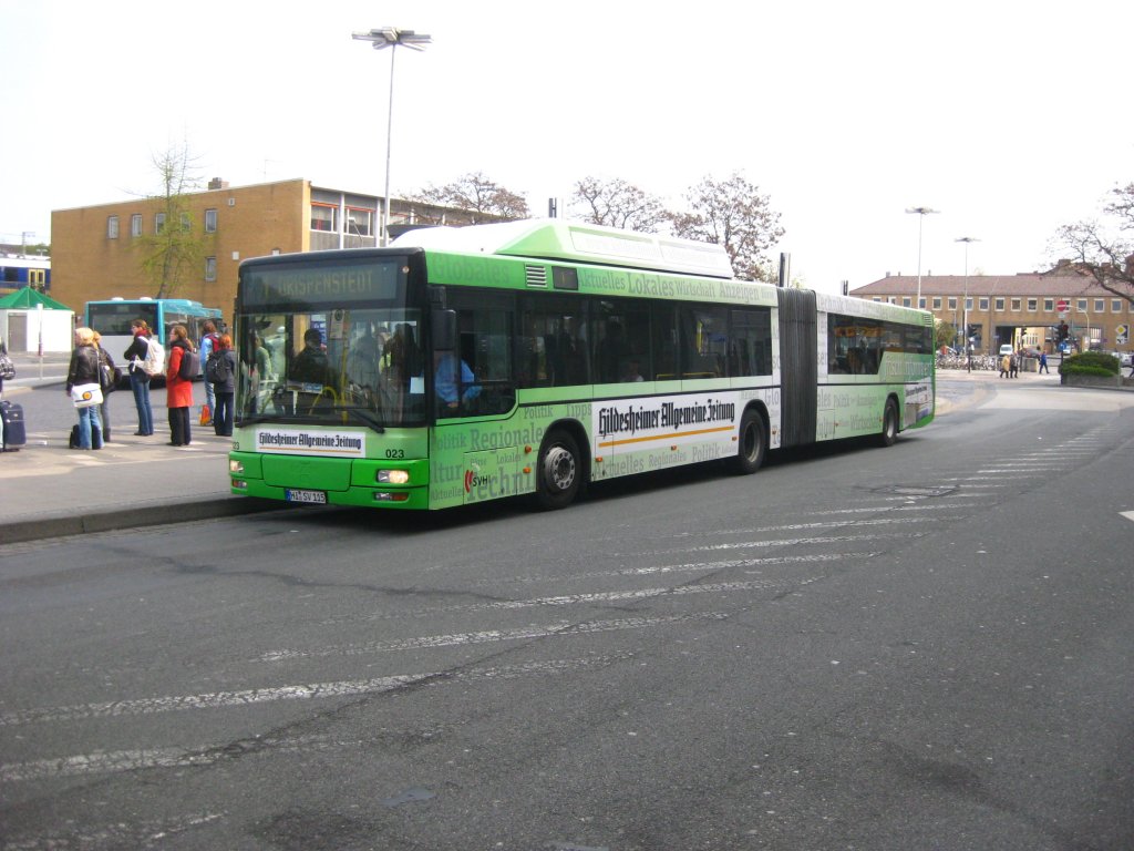 HI-SV 115 (Stadtverkehr Hildesheim GmbH) mit Werbung für die Hildesheimer Allgemeine Zeitung am 19.04.2010 am ZOB in Hildesheim.