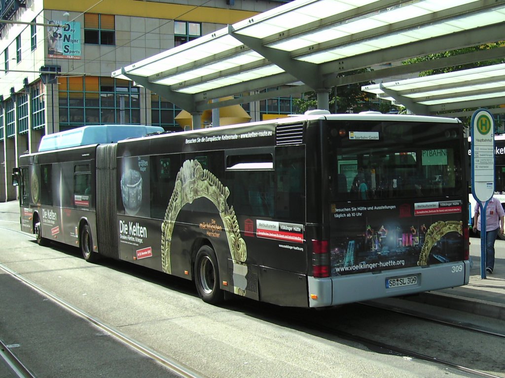 MAN Erdgas Gelenkbus. Die Werbung auf dem Bus weisst auf die Veranstaltung Die Kelten kommen hin. Die Ausstellung findet im Weltkultur Erbe Völklinger Hütte statt. Das Foto habe ich am 06.07.2010 gemacht.