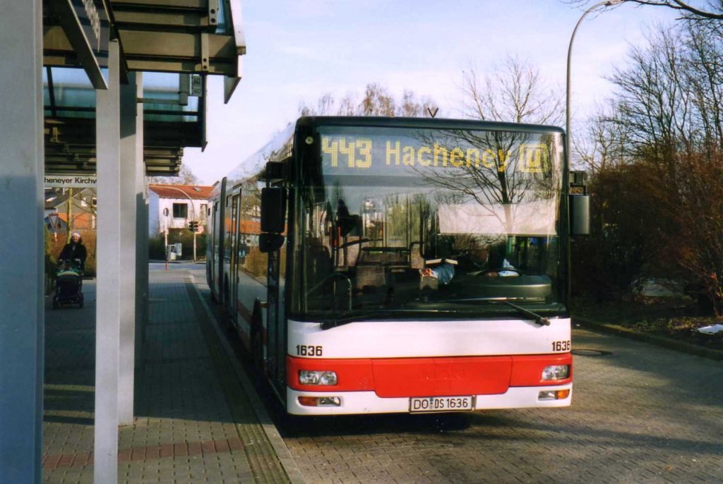 DSW 1636, ein MAN NG 263, aufgenommen im März 2002 an der Haltestelle Hacheney in Dortmund.
