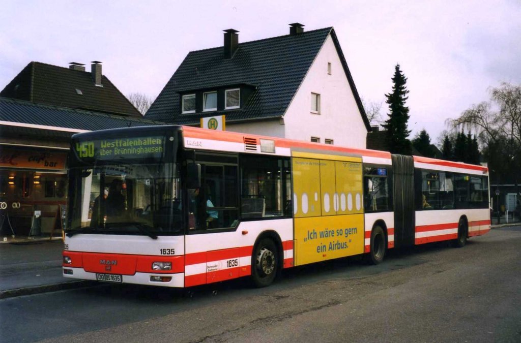DSW 1635, ein MAN NG 263, aufgenommen im Januar 2002 an der Haltestelle Kirchhörde in Dortmund.