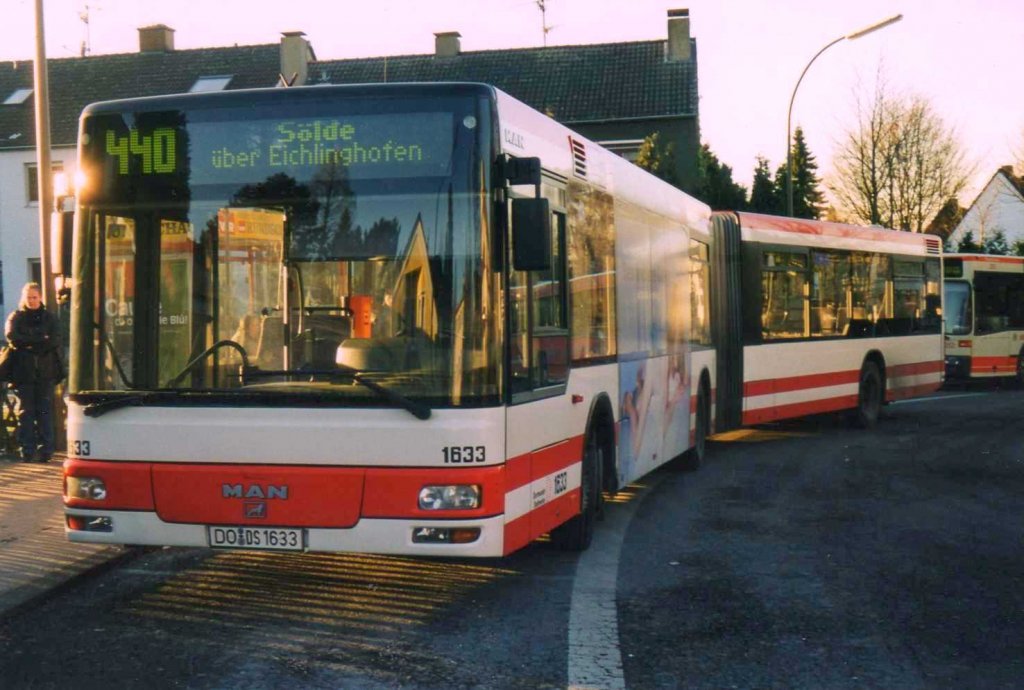 DSW 1633, ein MAN NG 263, aufgenommen im Januar 2002 an der Haltestelle Oespel Schleife in Dortmund.