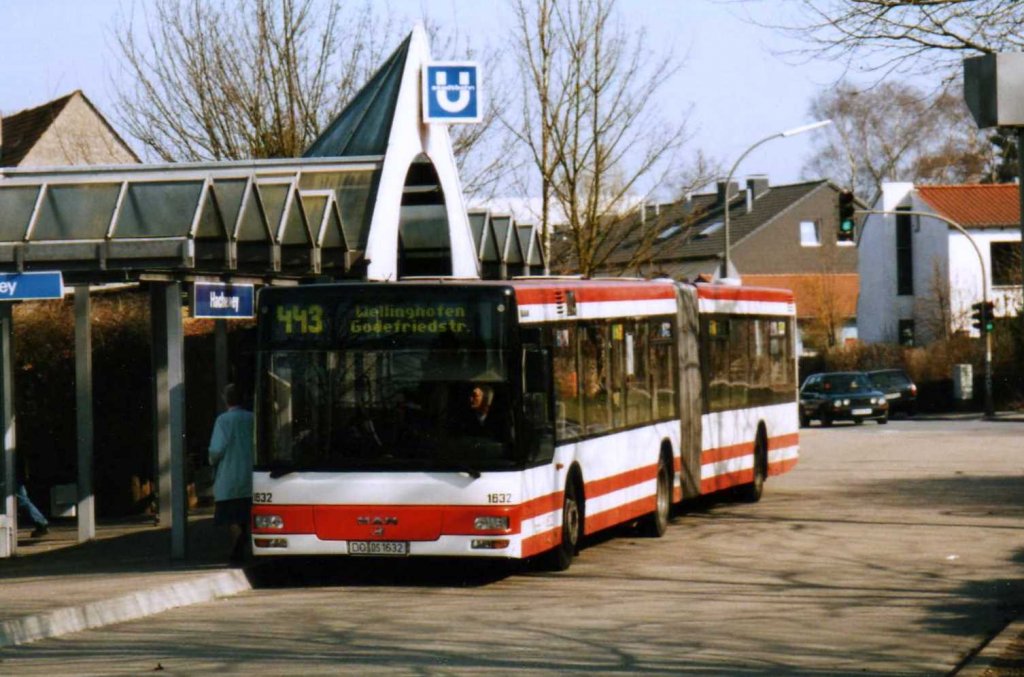 DSW 1632, ein MAN NG 263, aufgenommen im März 2002 an der Haltestelle Hacheney in Dortmund.