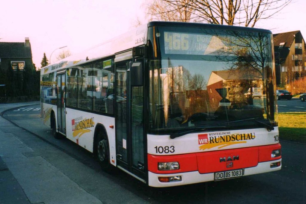 DSW 1083, ein MAN NL223, aufgenommen im Februar 2002 an der Haltestelle Oespel Schleife in Dortmund.