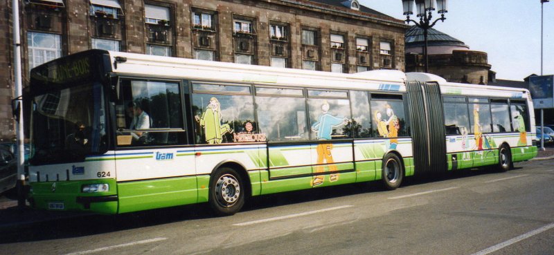 Gelenkbus Agora Nr 624 mit sonder Bemahlung vor dem Bahnhof am 20/07/01.